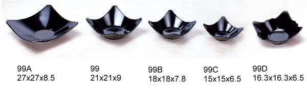 利泰實業廠 - 美耐皿角型缽 / 美耐皿盤子 / 美耐皿餐盤 / 美耐皿餐具 黑色系列 尺寸: 99 (21 x 21 x 9cm) 99A (27 x 27 x 8.5cm) 99B (18 x 18 x 7.8cm) 99C (15 x 15 x 6.5cm) 99D (15x15x6.5cm) **款式有乳白素色系列、瓷白加金系列 品質特性 :