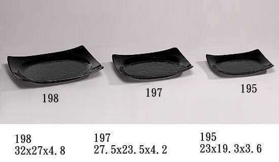 利泰實業廠 - 美耐皿長方內圓盤 / 美耐皿盤子 / 美耐皿餐盤 / 美耐皿餐具 / 美耐皿碗 黑色系列 尺寸: 195 (23 x 19.3 x 3.6cm) 197 (27.5 x 23.5 x 4.2cm) 198 (32 x 27 x 4.8cm) *款式有乳白素色系列、瓷白加金系列 品質特性 :