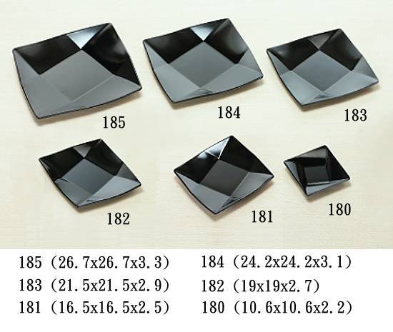 利泰實業廠 - 美耐皿中井盤 / 美耐皿方形小菜盤 / 美耐皿盤子 / 美耐皿餐盤 / 美耐皿餐具 / 美耐皿碗 / 美耐皿食具 黑色系列 尺寸: 177 (30.5 x 30.5 x 3.8cm) 178 (34.5 x 34.5 x 4.2cm) 179 (38.5 x 38.5 x 4.6cm) 181 (16.5 x 16.5 x 2.5cm) 182 (19 x 19 x 2.7cm) 183 (21.5 x 21.5 x 2.9cm) 184 (24.2 x 24.2 x 3.1cm) 185 (26.7 x 26.7 x 3.3cm) *另有瓷白加金系列、 乳白素色系列 品質特性 :