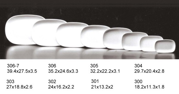 300 (18.2 x 11.3 x 1.8cm) 301 (21 x 13.2 x 2cm) 302 (24 x 16.2 x 2.2cm) 303 (27 x 18.8 x 2.6cm) 304 (29.7 x 20.4 x 2.8cm) 305 (32.2 x 22.2 x 3.1cm) 306 (35.2 x 24.6 x 3.3cm) 306-7 (39.4 x 27.5 x 3.5cm) *另有乳白素色系列、黑色系列