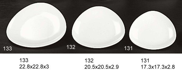 利泰實業廠 - 美耐皿三角盤 / 美耐皿盤子 / 美耐皿餐盤 / 美耐皿餐具 / 美耐皿碗 乳白素色系列 尺寸: 131 (17.3 x 17.3 x 2.8cm) 132 (20.5 x 20.5 x 2.9cm) 133 (22.8 x 22.8 x 3cm) **款式有黑色系列、瓷白加金系列 品質特性 :